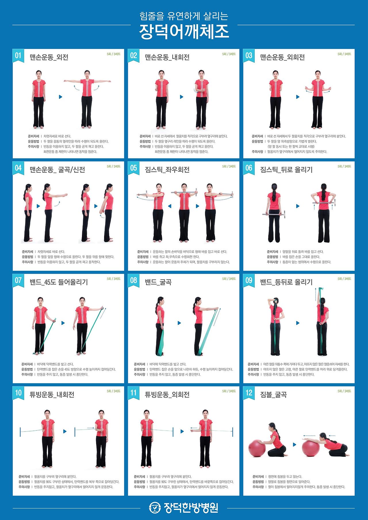 3. 저항 밴드를 이용한 운동 : 저항 밴드를 사용하여 팔을 옆으로 벌리거나 회전하는 운동을 합니다.